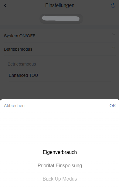 Damit wir deinen Batteriespeicher auf Wunsch intelligent steuern können, muss der Betriebsmodus auf Eigenverbrauch eingestellt sein, ansonsten kann es vorkommen, dass die Steuersignale nicht richtig verarbeitet werden. Diese Funktion kannst du separat in unserer App aktivieren.